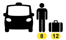 Up to 8 people, 12 luggage (Standard suitcases size is 46x69x29cms - 18x27x11in)..